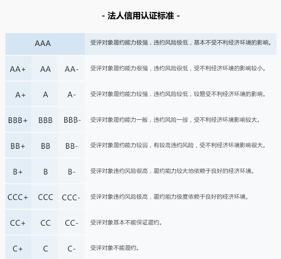 法人信用評(píng)級(jí)可不是隨便給的,它依據(jù)專業(yè)標(biāo)準(zhǔn),對(duì)企業(yè)履約能力、違約風(fēng)險(xiǎn)全方位 “體檢”。咱從 A+ 到 AA- ,意味著啥?按照法人信用認(rèn)證標(biāo)準(zhǔn),AA- 代表企業(yè)履約能力很強(qiáng),違約風(fēng)險(xiǎn)很低,面對(duì)經(jīng)濟(jì)環(huán)境波動(dòng),抗造能力也更出色 !