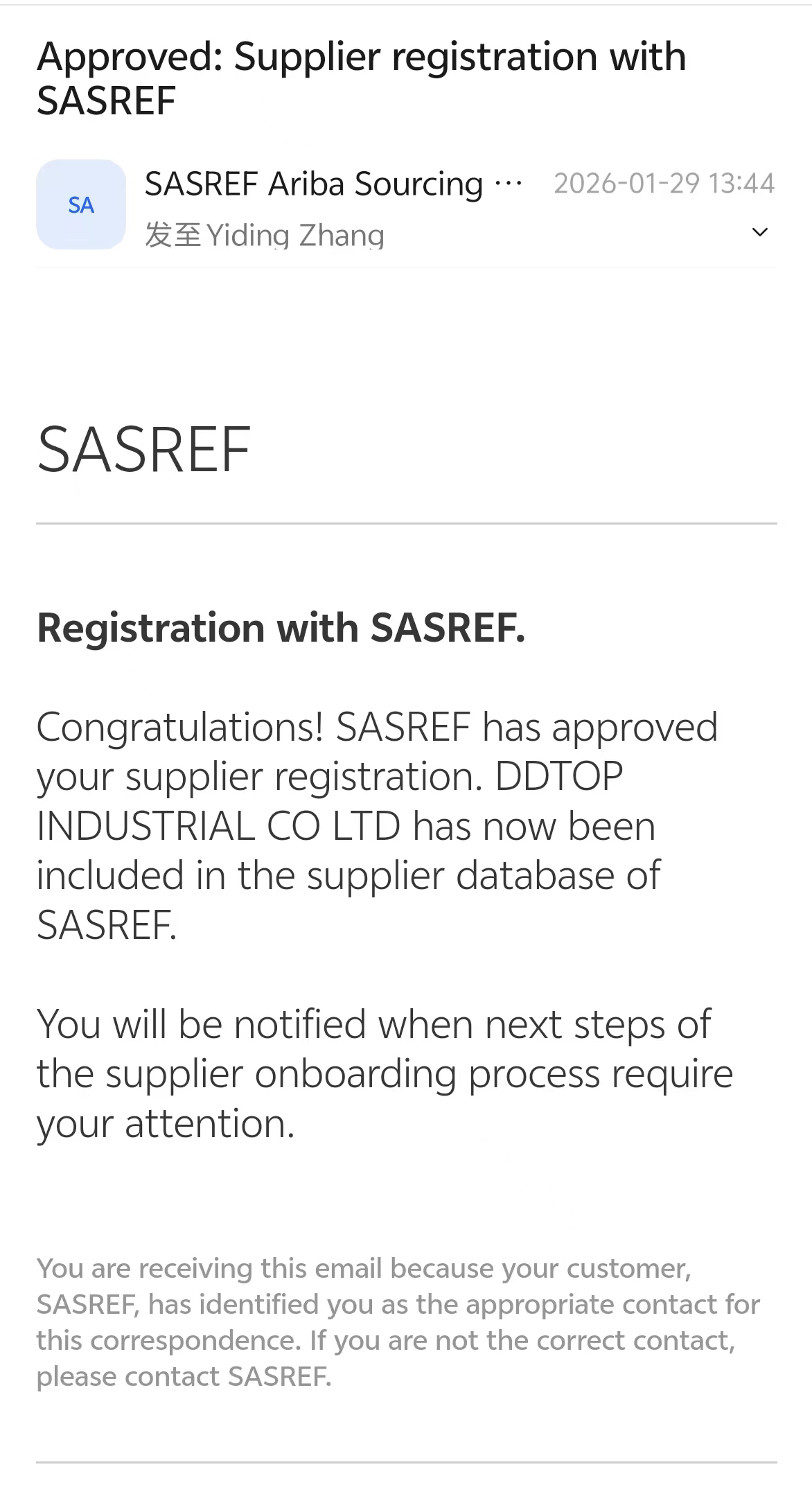 Exciting news! Glory begins! Recently, DDTOP?Group’s Saudi subsidiary, DDTOP?INDUSTRIAL CO LTD, has secured a major milestone: it has obtained Supplier Registration from SASREF (Saudi Aramco Jubail Refining Company). This official recognition as a qualified supplier marks a significant step forward in DDTOP?Group’s strategic expansion in the Middle East petrochemical market, ushering in new development opportunities.